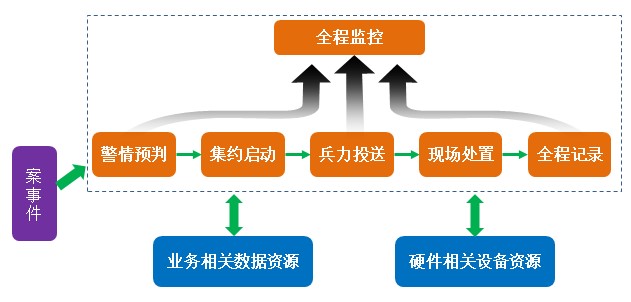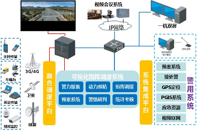 可視化指揮調度系統通過信息采集與視頻監控實時收集現場的案事件進展情況、處置力量行動處置狀態、社會聯動單位狀況等各方面信息,以情報分析、態勢展現、指揮保障為支撐,達到合理規劃資源,實時掌握處置力量動態情況,監控、督導執行情況,對所屬各個處置力量進行有效指揮。